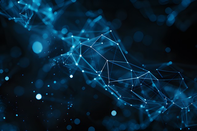 抽象低聚背景,深蓝色背景上的数字连接和点,大数据技术概念。网络空间中全球网络连接系统的矢量插图,网页