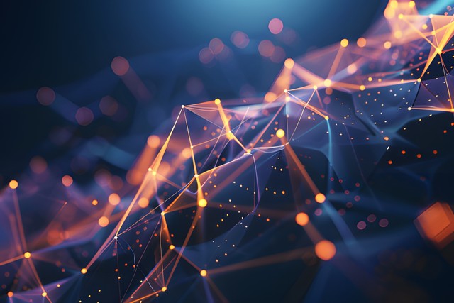 抽象低聚背景,深蓝色背景上的数字连接和点,大数据技术概念。网络空间中全球网络连接系统的矢量插图,网页