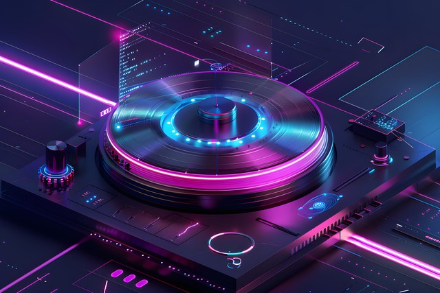抽象数字转盘的三维等距渲染图,周围环绕着浮动音符和未来全息元素,代表了传统音乐制作技术与先进技术的融