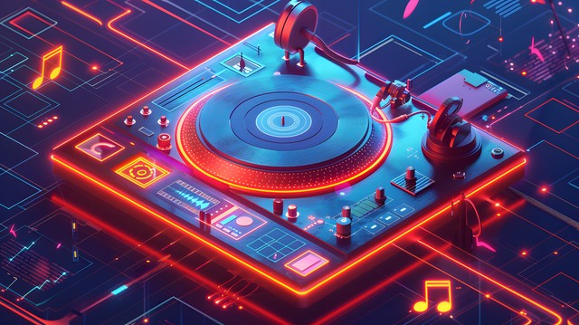 抽象数字转盘的三维等距渲染图,周围环绕着浮动音符和未来全息元素,代表了传统音乐制作技术与先进技术的融