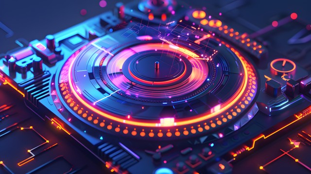抽象数字转盘的三维等距渲染图,周围环绕着浮动音符和未来全息元素,代表了传统音乐制作技术与先进技术的融