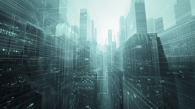 使用线条和数字元素进行抽象 3D 城市渲染。 具有线框纹理和随机数字的摩天大楼。 技术和连接概念。