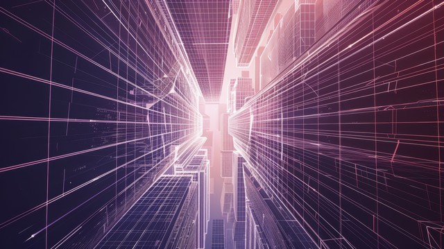 使用线条和数字元素进行抽象 3D 城市渲染。 具有线框纹理和随机数字的摩天大楼。 技术和连接概念。