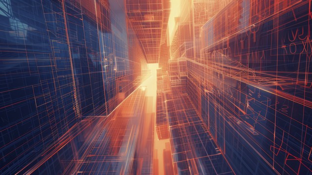 使用线条和数字元素进行抽象 3D 城市渲染。 具有线框纹理和随机数字的摩天大楼。 技术和连接概念。
