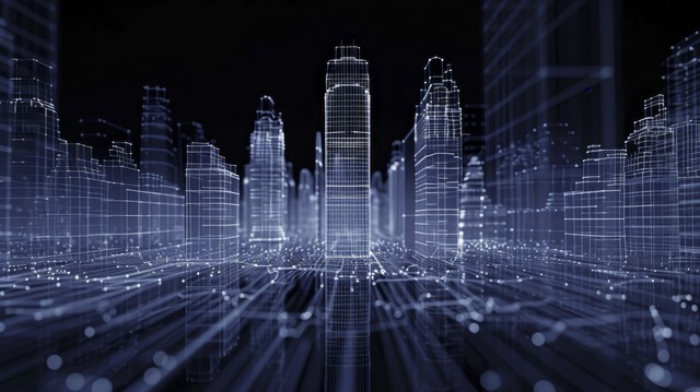 使用线条和数字元素进行抽象 3D 城市渲染。 具有线框纹理和随机数字的摩天大楼。 技术和连接概念。