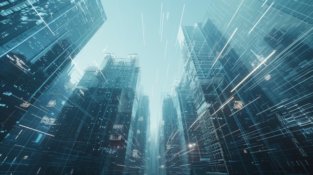使用线条和数字元素进行抽象 3D 城市渲染。 具有线框纹理和随机数字的摩天大楼。 技术和连接概念。