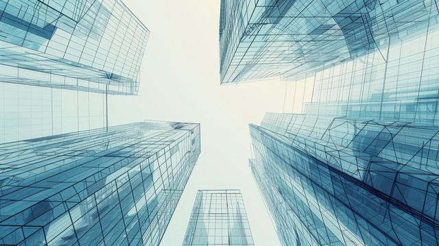使用线条和数字元素进行抽象 3D 城市渲染。 具有线框纹理和随机数字的摩天大楼。 技术和连接概念。