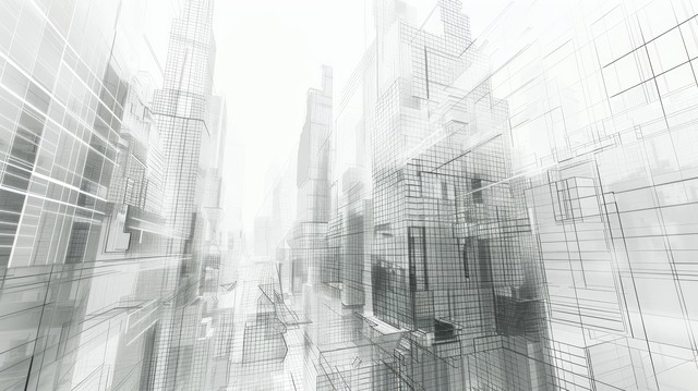 使用线条和数字元素进行抽象 3D 城市渲染。 具有线框纹理和随机数字的摩天大楼。 技术和连接概念。