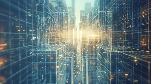 使用线条和数字元素进行抽象 3D 城市渲染。 具有线框纹理和随机数字的摩天大楼。 技术和连接概念。