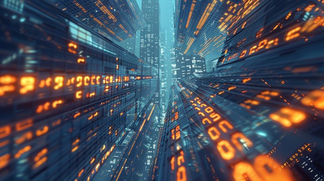 使用线条和数字元素进行抽象 3D 城市渲染。 具有线框纹理和随机数字的摩天大楼。 技术和连接概念。