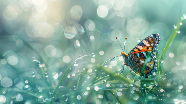 大自然中美丽的大滴新鲜晨露宏。 在户外的草地和蝴蝶上滴下透明的水。