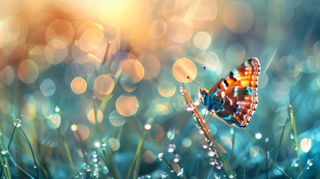 大自然中美丽的大滴新鲜晨露宏。 在户外的草地和蝴蝶上滴下透明的水。