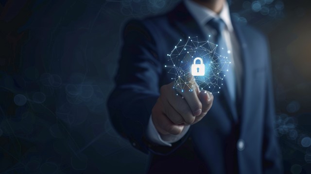 商人触摸指向技术背景上的封闭挂锁现代安全数字背景。 锁定保护系统网络安全和信息或网络保护 ChatG
