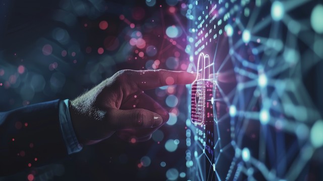 商人触摸指向技术背景上的封闭挂锁现代安全数字背景。 锁定保护系统网络安全和信息或网络保护 ChatG