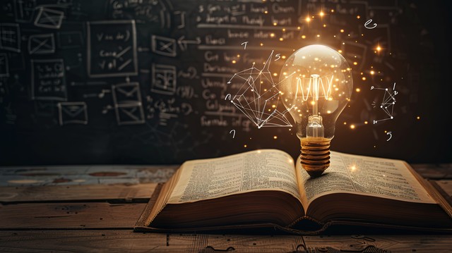 打开的书和散发思想之光的电灯泡——教育、思想和创意概念
