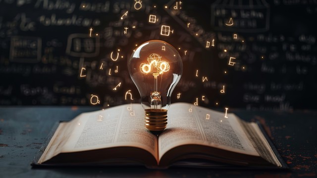 打开的书和散发思想之光的电灯泡——教育、思想和创意概念