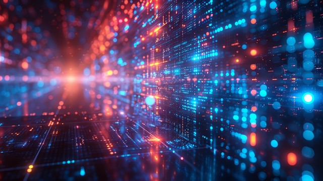 一只手指触摸虚拟界面,周围是数字网络和光点,象征着科技与未来。
