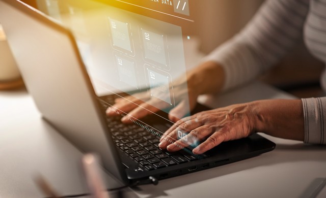 技术、信息空间和编程概念——老年妇女在家用笔记本电脑打字和带数据的虚拟全息图的特写镜头。带笔记本电脑和虚拟数据的老年妇女的手