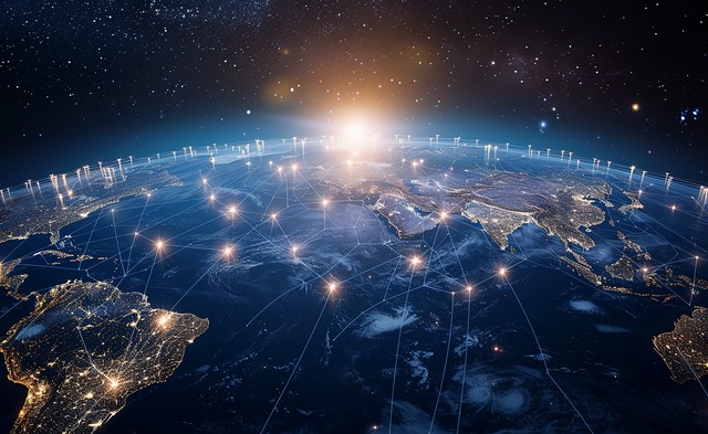 从太空看地球的数字景观,相互连接的节点线路组成网络,传递着地区之间的创新、速度、技术和数据传输