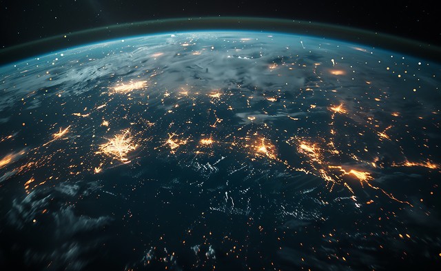 从太空看地球的数字景观,相互连接的节点线路组成网络,传递着地区之间的创新、速度、技术和数据传输