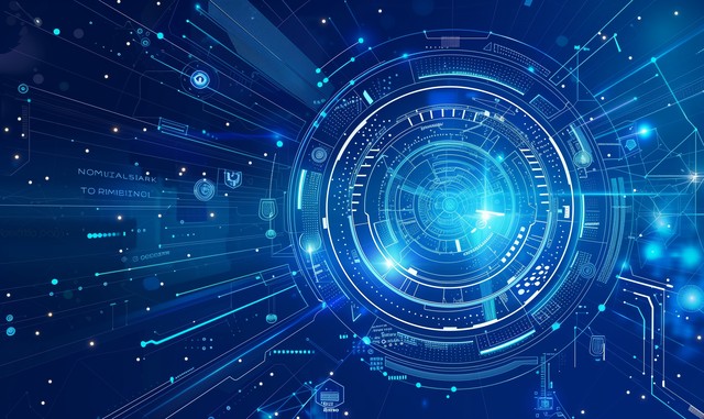 高科技数字技术概念,电子芯片,蓝色背景下的计算机技术插图,抽象的未来主义设计。