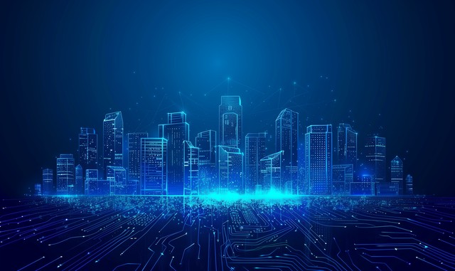 科幻,动态线条城市插图。高科技数字技术概念。蓝色背景下的城市,抽象的未来主义设计。