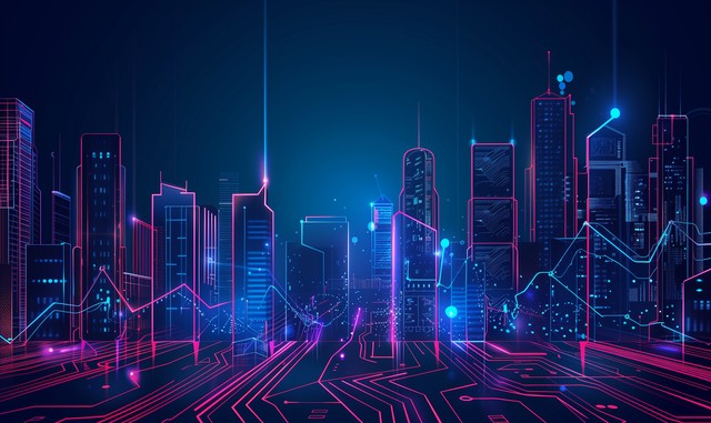 科幻,动态线条城市插图。高科技数字技术概念。蓝色背景下的城市,抽象的未来主义设计。