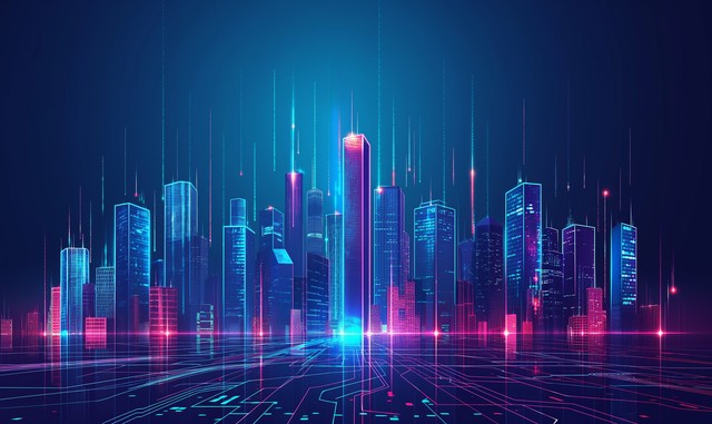 科幻,动态线条城市插图。高科技数字技术概念。蓝色背景下的城市,抽象的未来主义设计。