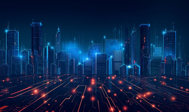 科幻,动态线条城市插图。高科技数字技术概念。蓝色背景下的城市,抽象的未来主义设计。
