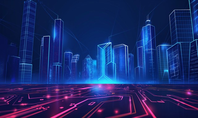 科幻,动态线条城市插图。高科技数字技术概念。蓝色背景下的城市,抽象的未来主义设计。