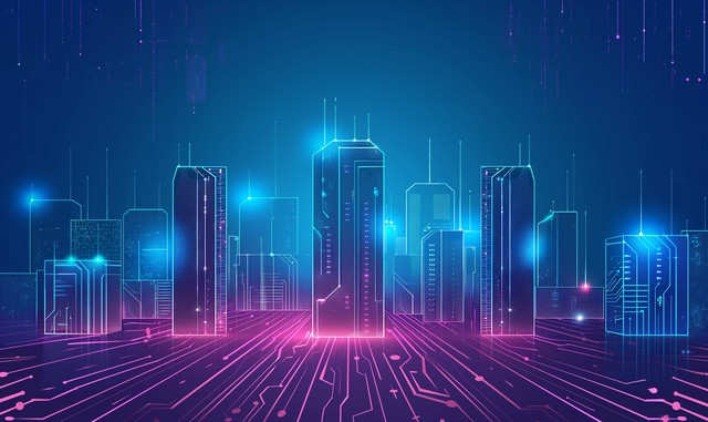 科幻,动态线条城市插图。高科技数字技术概念。蓝色背景下的城市,抽象的未来主义设计。