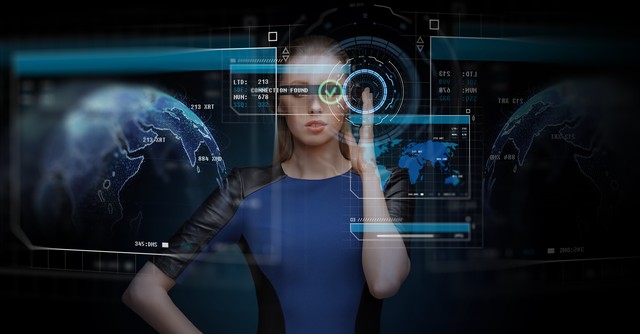 增强现实、科技概念——戴着未来3d眼镜的美女,虚拟屏幕投影在深蓝色背景上。带屏幕的虚拟现实3d眼镜中的女人