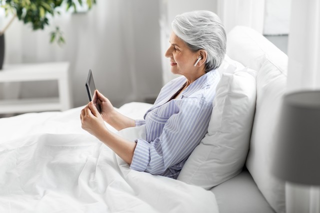 技术、老年和人的概念——家里卧室床上有平板电脑和无线耳机的老年妇女。床上有平板电脑和耳机的老年妇女