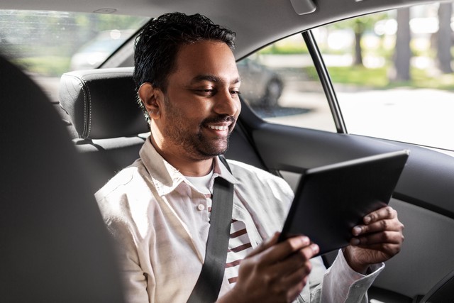 交通、车辆和人的概念——微笑的印度男性乘客在出租车上拿着平板电脑。出租车上拿着平板电脑的印度男性乘客