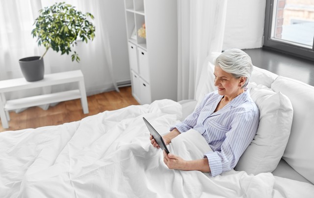 技术、老年和人的概念——家庭卧室床上有平板电脑的老年女性。家庭卧室床上有平板电脑的老年女性