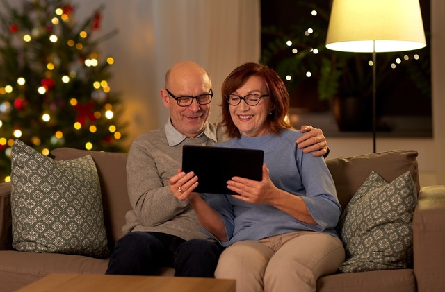 技术、寒假和人的概念——幸福微笑的老年夫妇晚上在家用平板电脑,背景是圣诞树灯。圣诞节家里有平板电脑的老年夫妇