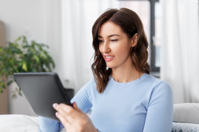 人、科技和休闲概念——家里有平板电脑的快乐少妇。家里有平板电脑的快乐微笑少妇