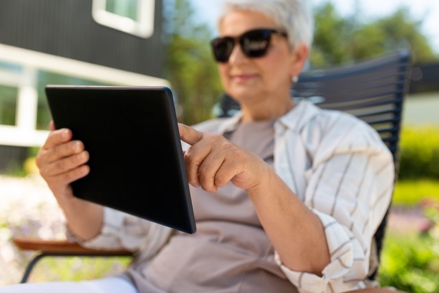 技术、老年和人的概念——在夏日花园休息的老年妇女与平板电脑的特写。夏季花园中使用平板电脑的妇女特写