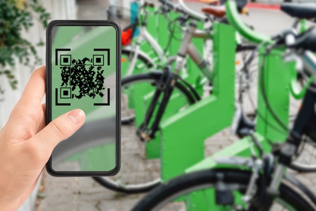 技术、交通和可持续发展概念——背景是城市街道电动自行车充电站自行车上方带有二维码的手持智能手机特写。电动自行车充电站电话上的二维码