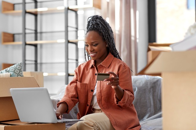 搬家、人和房地产概念——新家有笔记本电脑和信用卡的快乐微笑的女人。新家有笔记本电脑和信用卡的女人