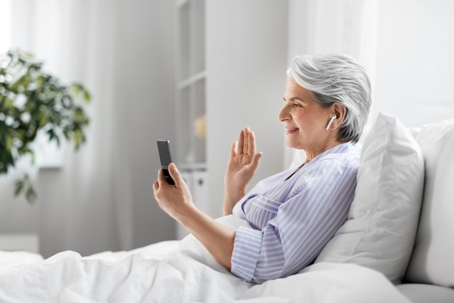 技术、老年和人的概念——带智能手机和无线耳机的老年妇女在家里卧室的床上进行视频通话。带电话的老年妇女在床上进行视频通话