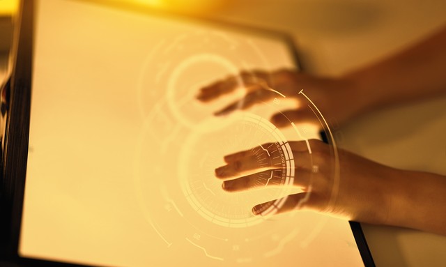 技术和人的概念-在夜间办公室手持led灯片或带有虚拟投影的触摸屏。在夜间办公室手持led灯片