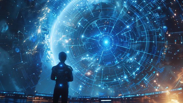 一个轮廓站在一个巨大的、发光的、未来感的数字界面前,类似于宇宙地图或星图,周围是复杂的蓝色技术计算机
