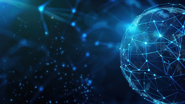 抽象的数字技术背景,发光的蓝色网络网格覆盖整个地球,暗空间背景上的全球连接概念