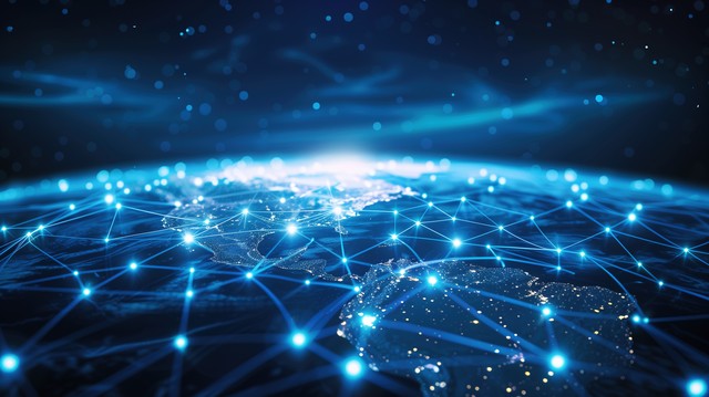抽象的数字技术背景,发光的蓝色网络网格覆盖整个地球,暗空间背景上的全球连接概念