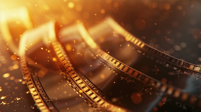 金色背景上的电影胶片,金色光影曲线,创意插画背景