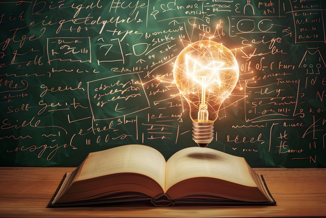 黑板前的灯泡和书本