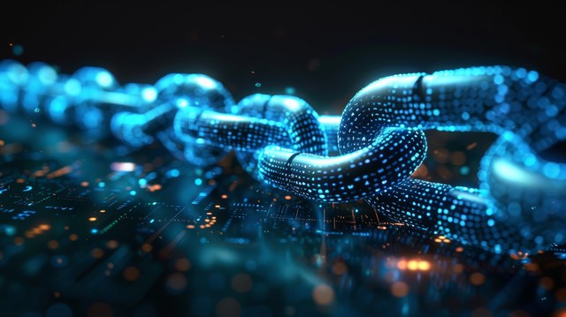 数字链条的艺术图像,展示了数据链条和区块链技术的概念。