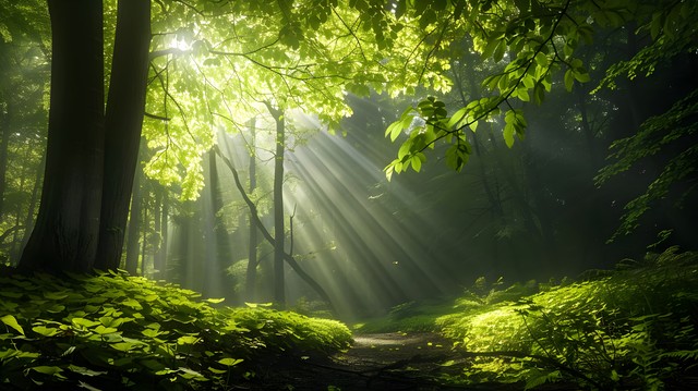 清晨阳光透过森林树叶描绘自然宁静与美丽的景象