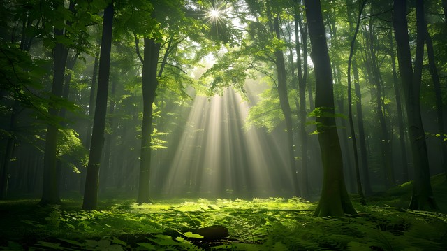 清晨阳光透过森林树叶描绘自然宁静与美丽的景象